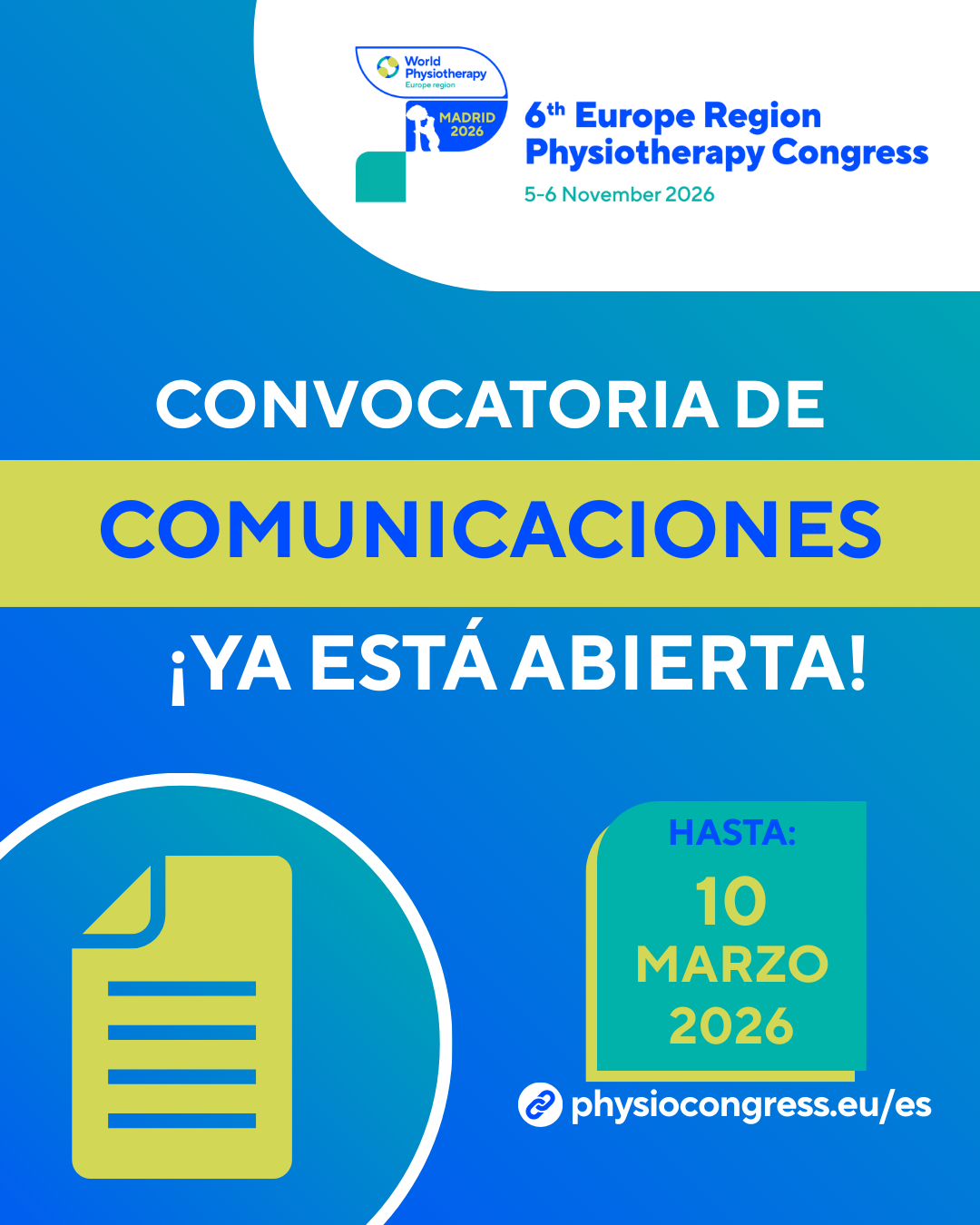 Ya está abierto el plazo para la presentación de comunicaciones del congreso www.physiocongress.eu/es/abstracts